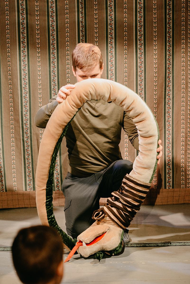 Не упустите и вы возможность поближе познакомиться со смышлёным удавом! Мадам Бодо обучила своего зелёного подопечного грамоте, и во время общения со зрителями Криктор с лёгкостью скручивается в разные буквы и цифры, выполняя задания детей. И это отнюдь не все его таланты! Криктор резво играет в снежки с маленькими зрителями, умеет подшутить над своей хозяйкой, а когда необходимо, приходит ей на помощь и героически спасает от грабителя! Уверены, этот остросюжетный поворот нашего атмосферного уютного спектакля с живым звучанием аккордеона особенно понравится и детям, и взрослым!